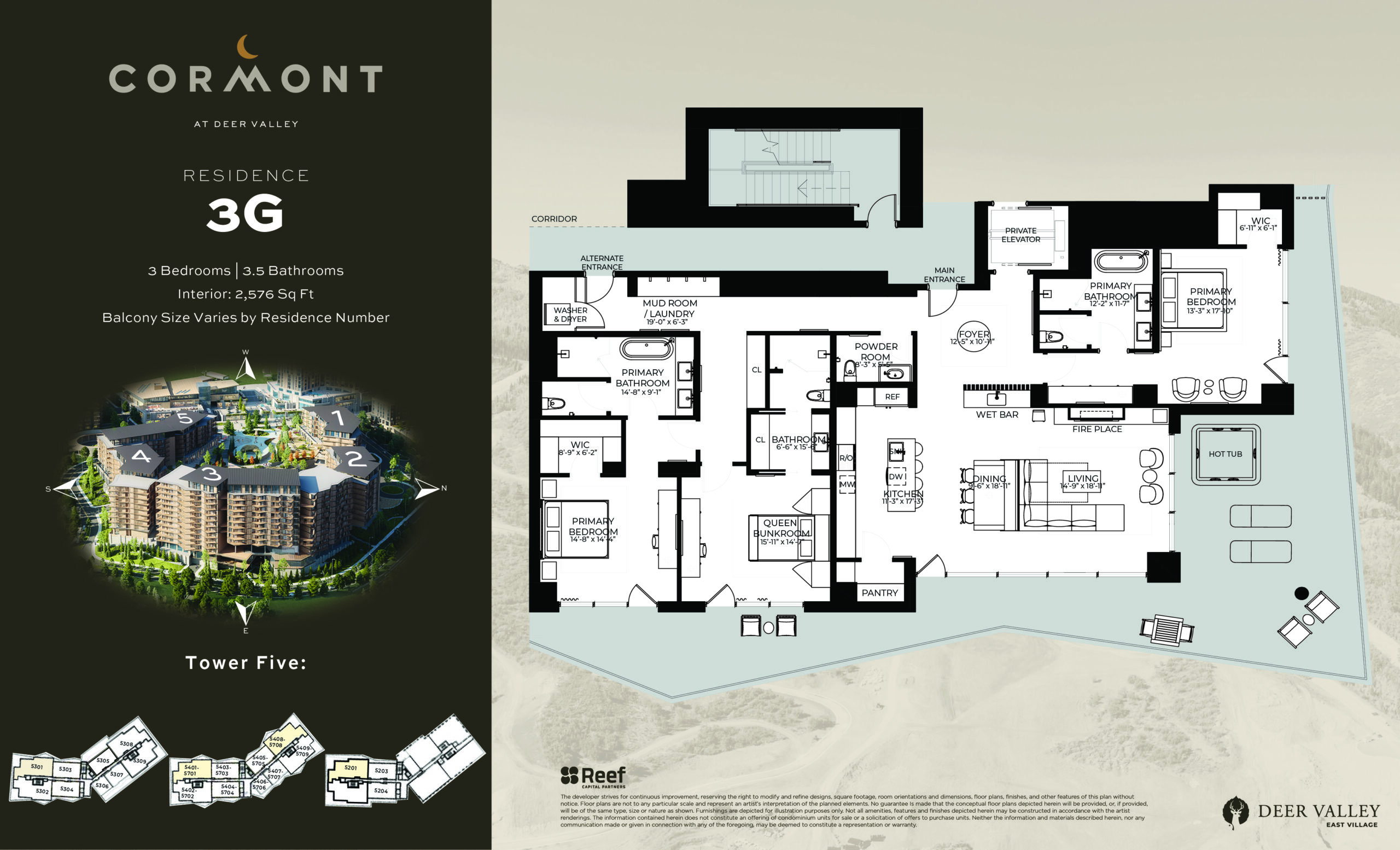 Unit 5708 includes a 1,109 SF Balcony, a hot tub, and a Private Elevator.